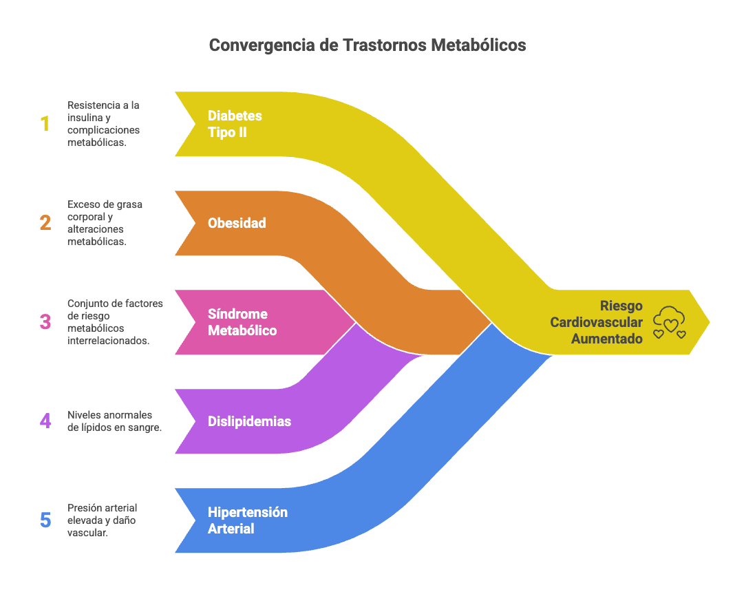 Las enfermedades cardiometabólicas representan un grupo integrado que incluye estas condiciones cardiovasculares y metabólicas, dada su estrecha relación clínica, fisiopatológica y de factores de riesgo compartidos, como la obesidad y la diabetes, que contribuyen significativamente a la morbimortalidad mundial.