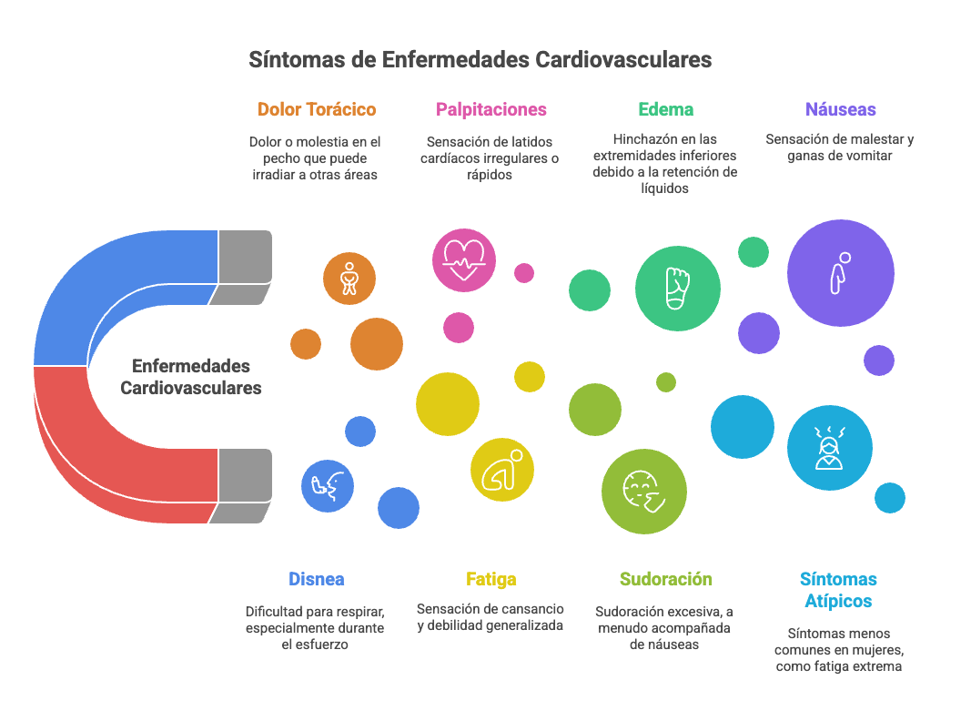 Las enfermedades cardiovasculares (ECV) y metabólicas presentan un conjunto de síntomas característicos, algunos comunes y otros específicos según la patología subyacente. A continuación, un resumen basado en literatura científica reciente (2020-2025) con referencias actualizadas: