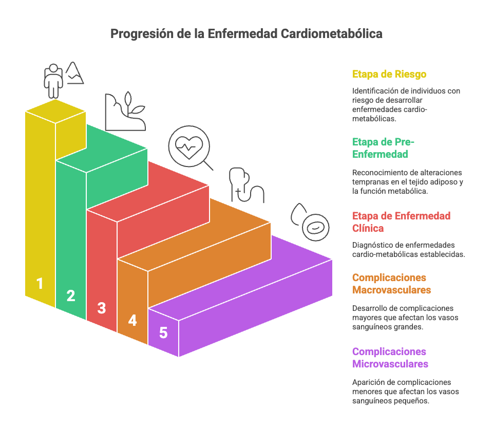 - La estratificación diagnóstica considera etapas de riesgo, pre-enfermedad (alteraciones en tejido adiposo y función metabólica), enfermedad clínica y complicaciones macro y microvasculares.