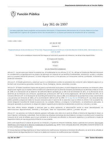 Establece mecanismos de integración social de las personas con discapacidad. Define medidas en educación, salud, trabajo, transporte, infraestructura y participación.