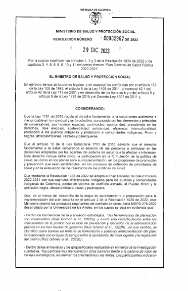 Se modifican los artículos 1, 2 y 3 de la Resolución 1035 de 2022 y varios capítulos del anexo técnico del Plan Decenal de Salud Pública 2022–2031, ajustando objetivos, ejes estratégicos, resultados esperados y orientaciones operativas para su implementación nacional y territorial.